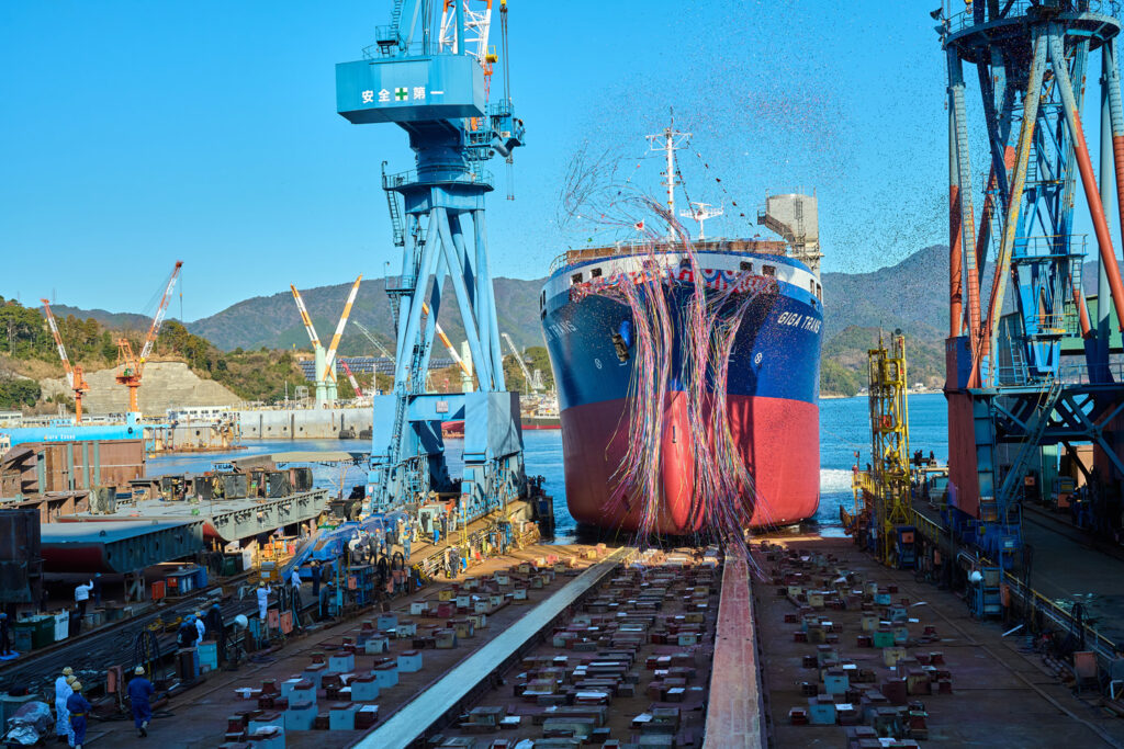 第1156番船 13,000総トン型重量物運搬船「GIGA TRANS」 命名・進水式 2026年1月6日(火)9:15より、進水式が執り行われました。 第1156番船船種:重量物運搬船全長:約130.00m / 幅:23.00m / 深さ:16.00m総トン数:約13,000トン載貨重量:約17,000トン速力:公試運転最大13.20ノット(時速約24.4km)竣工日:令和8年5月下旬